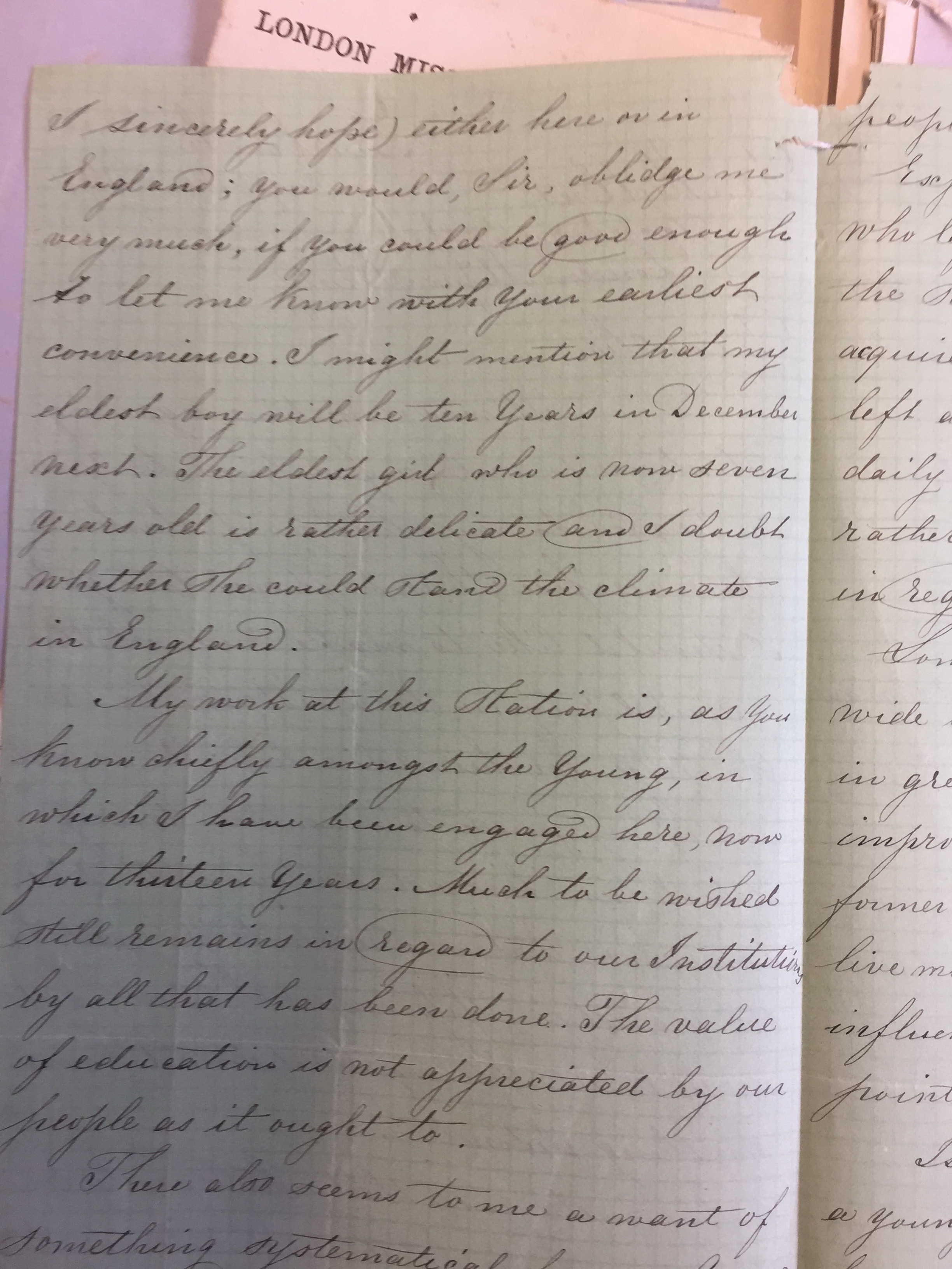 Michael Jr. refers to one of his children – William Thomas – in a letter to his LMS superiors, written in 1869.  In beautiful copperplate handwriting he asks if they would be able to fund his children’s education back in England.  We have no idea as to whether they did or not.