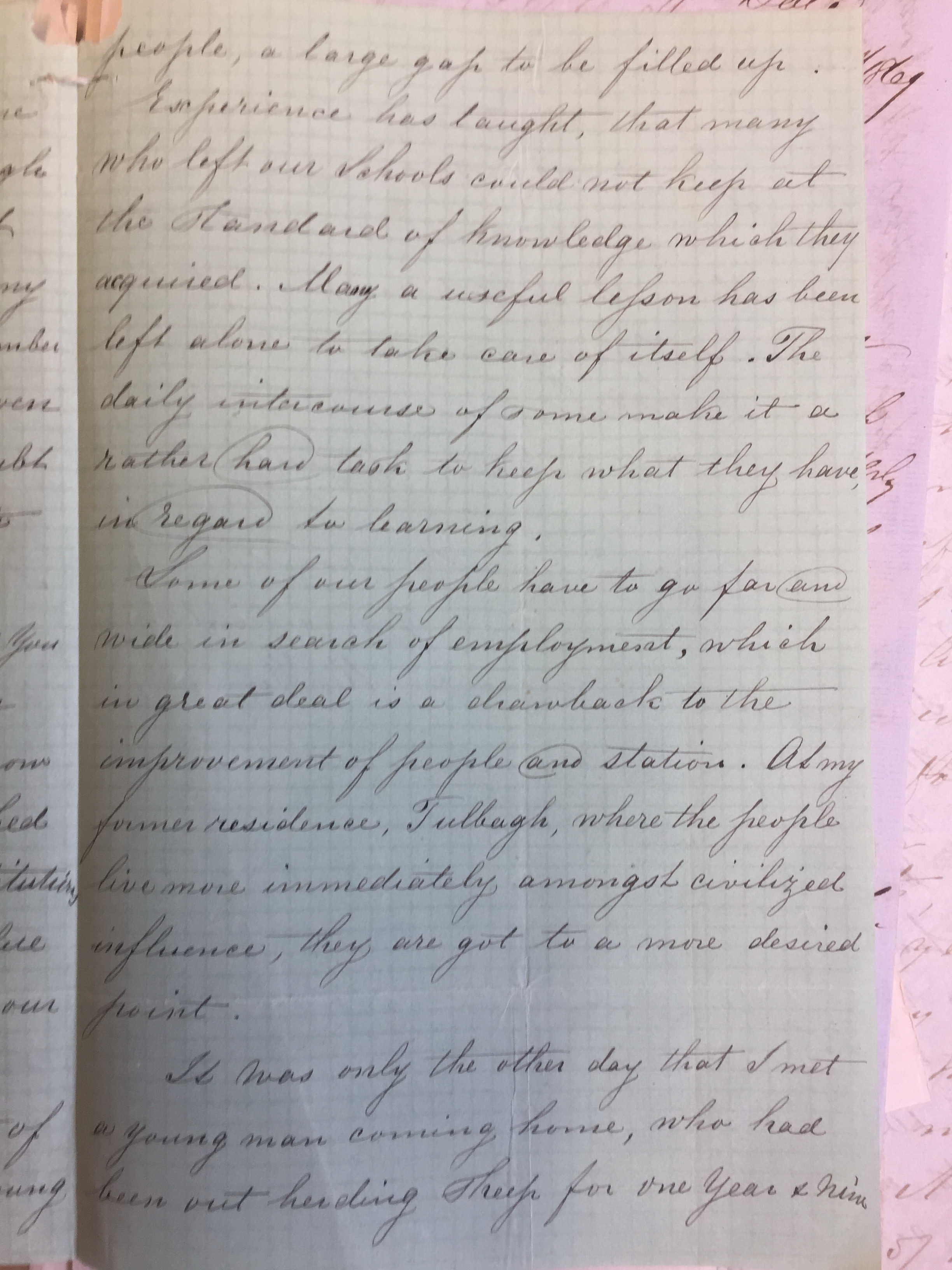 Some of our people have to go far and wide in search of employment, which in a great deal is a drawback to the improvement of people and station. …. It was only the other day that I met a young man coming home, who had been out herding sheep for one year and nine months, he left our school about three years ago and was of the cleverest boys in my school at that time.